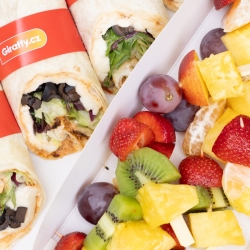 Tento box nabízí 8 polovin wrapů v osvědčených kombinacích masa, sýra a čerstvé zeleniny, doplněno o svěží ovocné špízy.